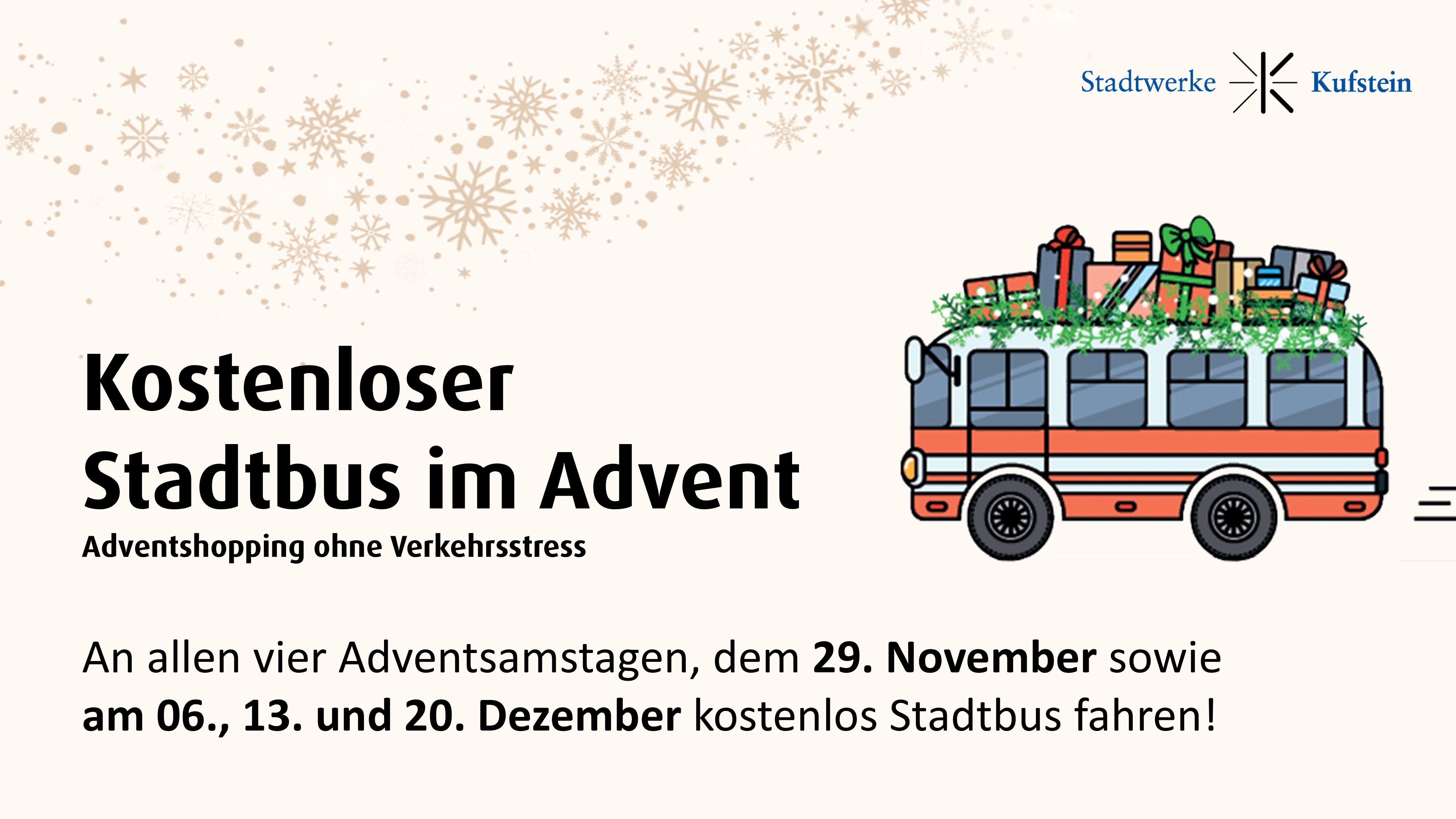 In der hektischen Adventszeit, wenn das Kufsteiner Stadtgebiet durch vermehrten Verkehr belastet wird, gibt es eine stressfreie Alternative: den Stadtbus kostenlos nutzen! Die Stadtwerke Kufstein ermöglichen auch in diesem Jahr die kostenfreie Nutzung des beliebten Nahverkehrsmittels – an allen vier Adventsamstagen.