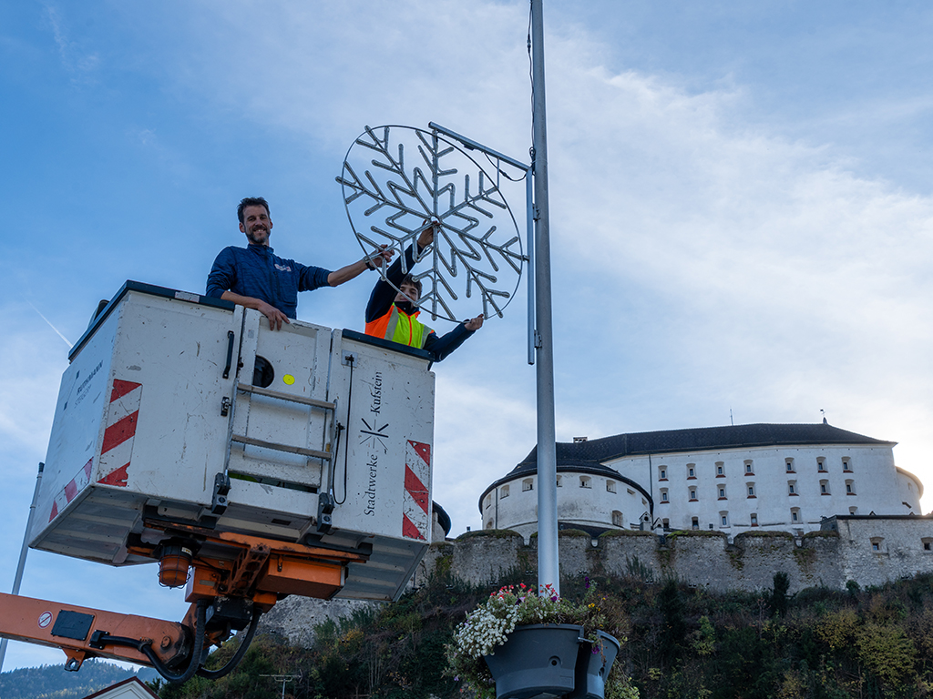 Derzeit sind David Naschberger mit Lehrling Matteo Wimmer und Florian Duregger mit Lehrling Ediz Kizildogan von ECK Elektroinstallation im Kufsteiner Stadtgebiet unterwegs, um die Weihnachtsbeleuchtung zu montieren. Mithilfe des "Steigers" und eines weiteren, kleinen Krans werden die Leuchtelemente in luftiger Höhe angebracht.