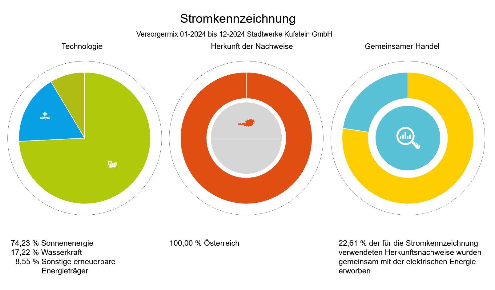 Stromkennzeichnung gem. § 78 Abs. 1 und 2 ElWOG 2010 sowie die Stromkennzeichnungsverordnung 2022 – KenV 2022 über den Anteil an verschiedenen Primärenergieträgern, auf Basis derer die gelieferte elektrische Energie im Zeitraum 01.01.2024 bis 31.12.2024 erzeugt wurde. Bei der Erzeugung des vorliegenden Versorgermixes fallen weder CO²-Emissionen noch radioaktive Abfälle an.