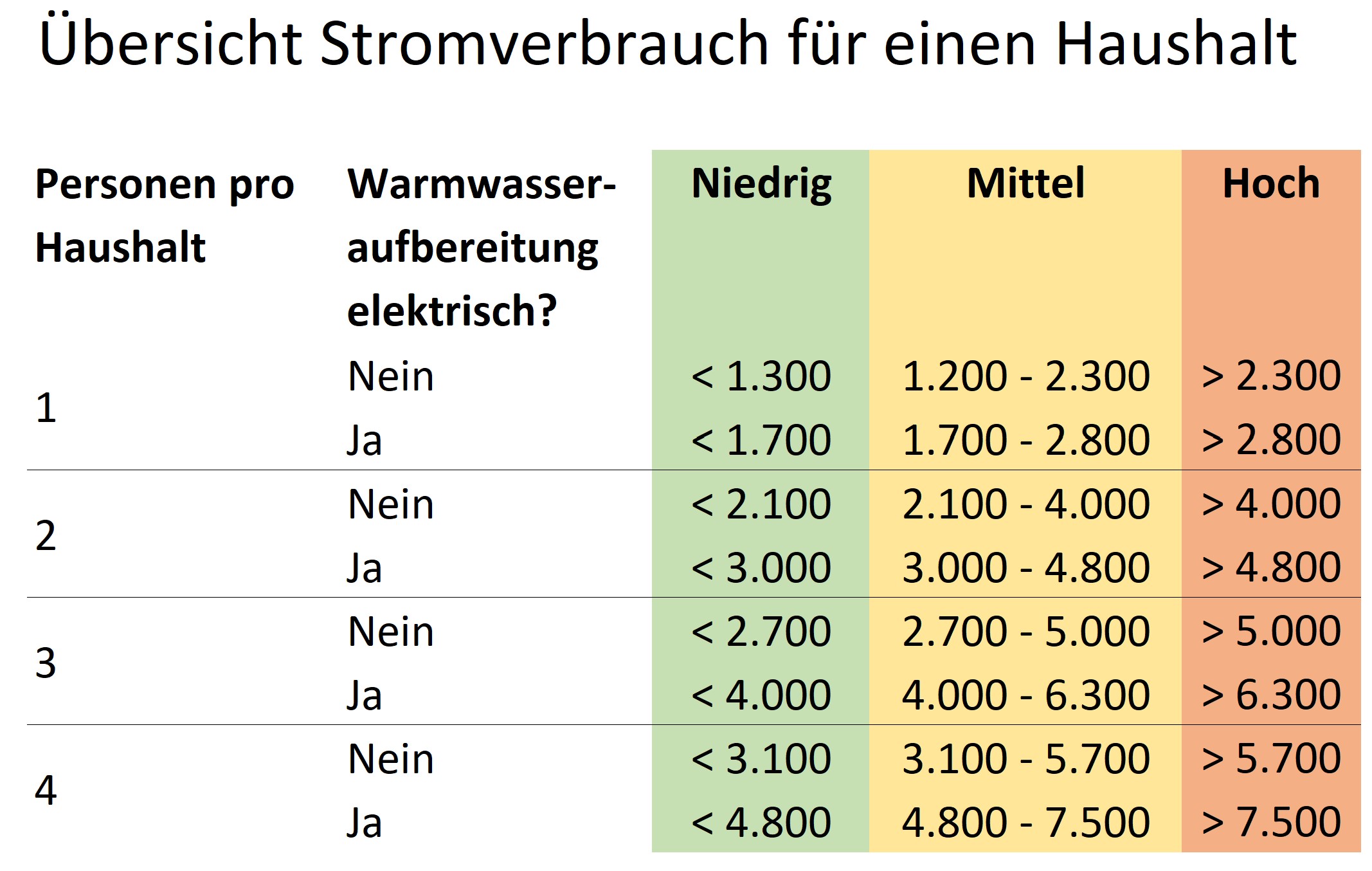 Die Grafik gibt Auskunft wie viel Stromverbrauch ein Haushalt pro Jahr im Durchschnitt hat. Dieser ist abhängig von der Anzahl Personen im Haushalt und ob eine elektrische Warmwasseraufbereitung erfolgt. Die angegeben Werte sind nur Näherungswerte.